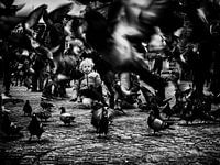 Een kind dacht de duiven op de Dam rustig te kunnen voeren, tot de vogels ineens besloten allemaal tegelijk op te vliegen! Gelukkig had ik het gezicht net scherp en spreekt zijn gezichtsuitdrukking boekdelen!