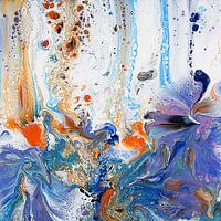 Blauwe en lila tinten vermengen zich tot een massa op de bodem van het schilderij, met wervelingen en kolken, bijna als de rand van een woeste zee. Een deel van het blauw stijgt op in strepen en bellen naar boven. Misschien probeert het te ontsnappen? Druppels en strepen oranje dalen neer op het schilderij en creëren bijna een 'plons' waar het het blauw raakt en erdoor wordt opgeslokt.