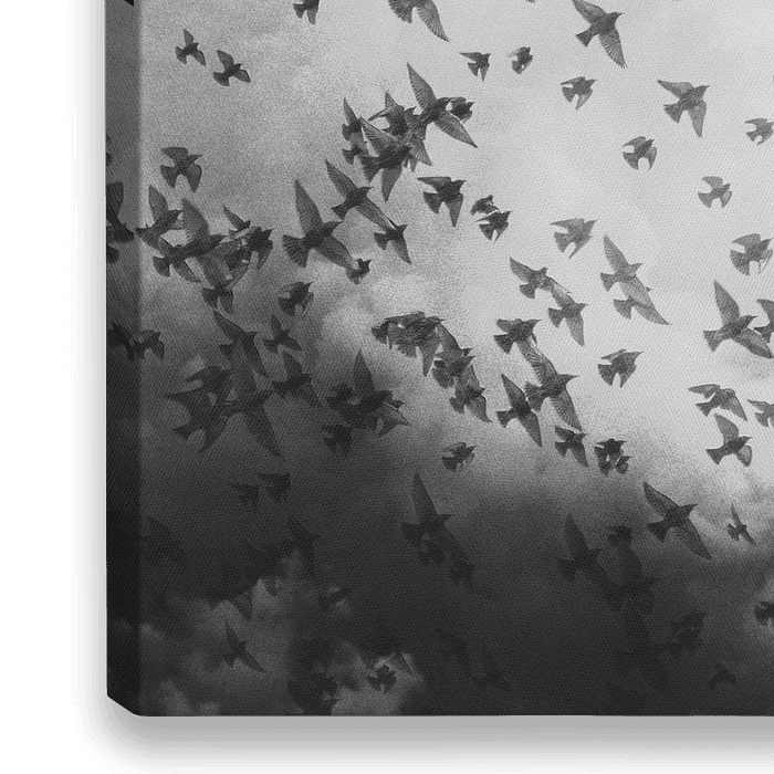 Conceptuele foto kunst in zwart wit met een vrouw en een zwerm vogels over dromen en nachtmerries