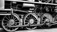 Oude vintage stoomlocomotief wielen detail in zwart-wit van dichtbij. De ijzeren drijfwielen worden aangedreven door de zuigers van de locomotief.