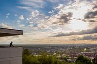 Wanneer je in de Duitse stad Karlsruhe bent, neem dan de kabelspoorbaan de heuvel op. Eenmaal op de Turmberg heb je prachtig uitzicht over Karlsruhe en omgeving van Baden-Württemberg. Ik maakte deze foto 's avonds vlak voor zonsondergang. De fietser kijkt vanaf het uitkijkpunt over de stad.