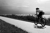 Wielrenner fietst op dijk onweersbui tegemoet in zwart/wit