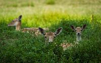 Drie jonge hertjes wachten tot hun moeder weer terug is en houden zich zo veel mogelijk verscholen in het hoge gras, door hun witte vlekjes zijn ze goed gecamoufleerd.