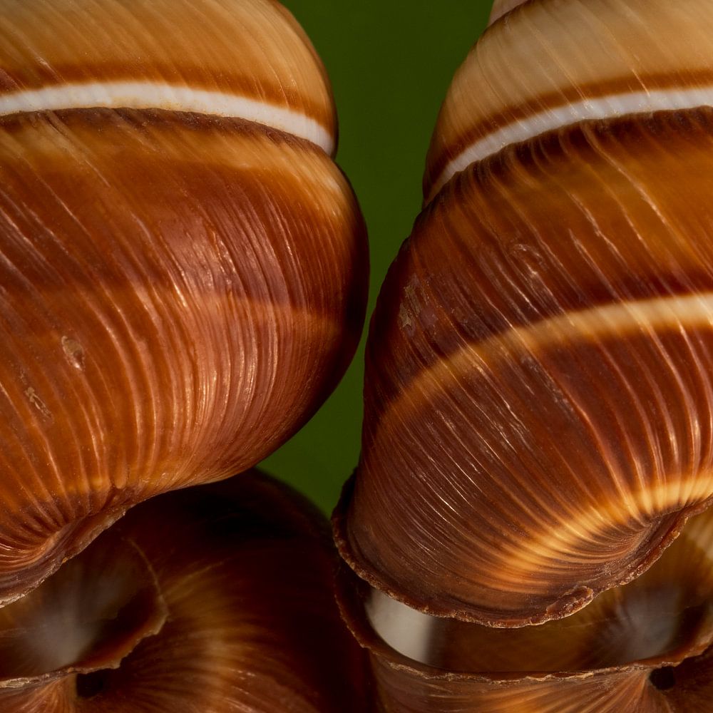 De twee schelpen liggen op een spiegelend oppervlak. Hierdoor ontstaat er in het grondoppervlak een reflectie van de twee huisjes. In deze reflectie zie je de slakkenhuisjes vanuit een andere hoek. Dit geeft een mooi effect aan de foto.