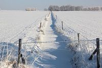 Winterlandschap in de omgeving van Nijkerk. Een dichtgevroren en besneeuwd slootje neemt u mee naar de bomen in de verte.