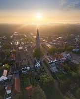 Een dronefoto van het centrum van Wijhe met duidelijk de Nicolaaskerk in beeld.