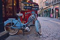 De charmante wijk Vieux Lyon in de Franse stad Lyon, met zijn geplaveide straatjes en vintage decoratie met een oude gemotoriseerde fiets en trappers, alles omgeven door typische winkels van de poppenstad.