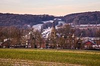 Het dorp Wijlre en de besneeuwde helling vanuit Beertsenhoven naar Berghöf waarbij het dun laagje sneeuw de huizen en de kerk beter laat uitkomen tegen de achtergrond.