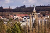 Het dorp Wijlre op een winterse dag gezien vanaf gehucht Beertsenhoven in het Zuid-Limburgse Heuvelland (Nederland)