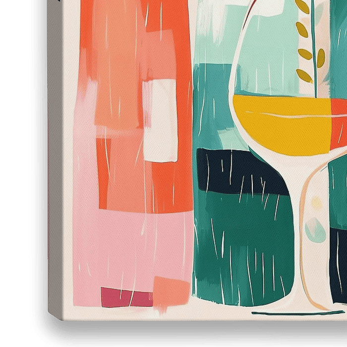 Speelse en kleurrijke compositie van wijnflessen en een wijnglas, omringd door gestileerde planten en abstracte vormen. De illustratieve stijl is vrolijk en nodigt uit tot een gevoel van gezelligheid en festiviteit.