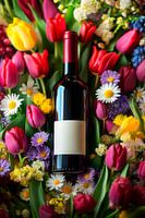 Te midden van een kleurrijke zee van tulpen en madeliefjes schittert een elegante wijnfles met een minimalistisch etiket. Deze harmonieuze compositie van levendigheid en plezier doet denken aan gezellige avonden en een feestelijke sfeer. Perfect voor in de keuken of eetkamer en geeft een speciaal tintje aan elke bijeenkomst.