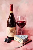 Een elegant feest voor de zintuigen: een dieprode wijnkous rust naast een goed gekozen blauwe kaas, waarvan de romige textuur je uitnodigt om ervan te genieten. Een glinsterend wijnglas reflecteert het zachte licht, terwijl sappige druiven de compositie bekronen. Dit harmonieuze arrangement belooft plezierige momenten en gezellige bijeenkomsten.