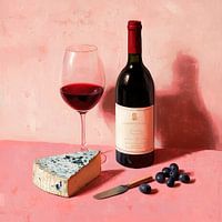 Een verleidelijk stilleven ontvouwt zich: een volle rode wijn vult een elegant glas, terwijl een gouden plak kaas met blauwe aderen er verleidelijk naast ligt. Sappige bessen staan charmant langs de rand en een zilveren mes glinstert in het zachte licht. Het roze gekleurde oppervlak omlijst dit verrukkelijke tafereel en nodigt uit tot verwennerij.