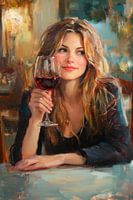 In een betoverend moment van sereniteit heft ze haar glas rode wijn terwijl haar stralende glimlach geheimen prijsgeeft. Haar volle gouden bos haar omlijst een gezicht vol leven en gratie. De warme, uitnodigende sfeer om haar heen suggereert dat dit moment gevuld is met plezier en verrukking. Een echte traktatie voor de zintuigen.