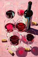 Een expressief schilderij dat de sfeer van een gezellige wijnproeverij vangt tegen een roze achtergrond. De compositie toont meerdere wijnglazen gevuld met dieprode wijn, een donkere wijnfles en verspreid liggende kurken. De losse penseelstreken en de textuur van de verf geven het werk een levendige, moderne uitstraling, terwijl de warme kleuren en reflecties in het glas een intieme sfeer creëren.