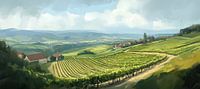 Wijngaard Heuvels | Green Whisper - Dit landschapsschilderij toont een uitgestrekte wijngaard die zich uitrolt over glooiende heuvels, onderbroken door kleine boerderijen en een weids uitzicht op de horizon.