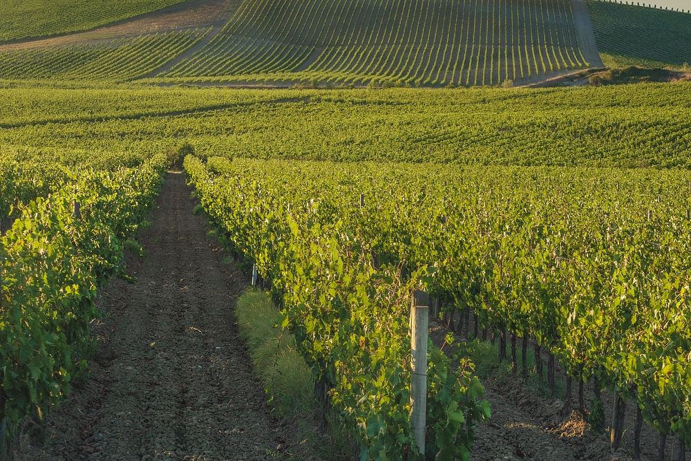 Wijngaarden bij zonsondergang. Bomen op de top van de heuvel. Castellina in Chianti, Toscane, Italië, Europa.