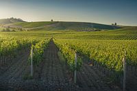 Wijngaarden bij zonsondergang. Bomen op de top van de heuvel. Castellina in Chianti, Toscane, Italië, Europa.