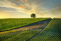 Wijngaard en een boom bij zonsondergang. Castellina in Chianti, regio Toscane, Italië, Europa.