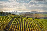 Wijngaarden landschap in Castellina in Chianti in de herfst mistige ochtend, Toscane, Italië