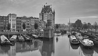 Zwartwit opname van de wijnhaven met het witte huis en binnenvaartschepen op de voorgrond.