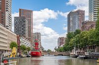 Zicht over de Wijnhaven in Rotterdam. In de verte is De Regentessebrug te zien. Dit is een vaste brug. De brug verbindt de Posthoornstraat met de Glashaven over het water van de Wijnhaven. De brug wordt in de volksmond ook wel de Vierleeuwenbrug genoemd. Het rode vaartuig de Vessel 11 trekt met de rode kleur de aandacht en de oerhollandse blauwe lucht met schapenwolkjes maakt het beeld compleet. Het ook wordt als het ware steeds verder de Wijnhaven in getrokken. De boten langs de kade doen nostalgisch aan, langs de kade staan de hoge wolkenkrabbers van moderne nieuwbouw.