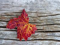 Een mooi rood gekleurd druivenblad op een stuk hout in een wijngaard. Een prachtig stilleven.