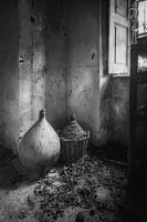 Een oude wijnkruik en een wijnmand in een verlaten Italiaans kasteel.