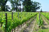 Wijnranken op een rij met schaduw in de rotsachtige bodem - idyllisch Frans kasteel op de achtergrond