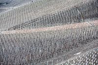 Wijnstokken op de hellingen van de Moezel in Duitsland staan in rij en gelid. Daardoor ontstaat een interessante vlakverdeling in vooral grijze tinten met de nadruk op diagonalen.
