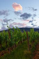 Wijnvelden in de Elzas, Frankrijk tijdens zonsondergang. De Elzas staat niet alleen bekend om de vakwerkhuisjes, maar ook om de wijn. In de omgeving van Colmar vind je kleine plaatsjes als Riquewihr, Truckheim, Kayserberg, Bergheim en Eguisheim. Allen gelegen tussen de wijnvelden van de Elzas