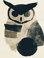 Deze grafisch abstracte uil straalt kracht, rust en mysterie uit. De compositie bestaat uit geometrische vormen en zachte texturen in zwart, wit en grijstonen. De iconische kop met brede wenkbrauwveren is meteen herkenbaar, maar de vorm blijft open voor interpretatie — een spel tussen dier en vorm, natuur en ontwerp.