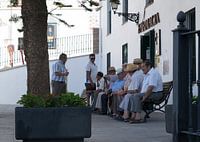 Op een bankje in een Spaans dorp . Zaten de heren de dag door te nemen.