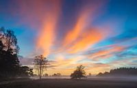 Zonsondergang in de winter boven de heide bij de schaapskooi van Heerde op de Veluwe in Gelderland.
