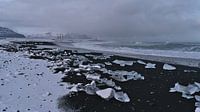 Uitzicht op het beroemde Diamantstrand bij Jökulsárlón aan de zuidkust van IJsland in de winter met kleine ijsbergen in het zwarte lavazand en wilde branding op een bewolkte dag.