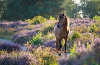 Een wild IJslands paard op de Posbank in de Veluwezoom, met de paarse heide in bloei en het licht van de zonsondergang.