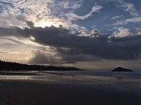 Gezicht op het wilde zandstrand Long Beach ("long beach") in het Pacific Rim National Park Reserve op Vancouver Island in British Columbia, Canada in ruwe zee met de ochtendzon die door de wolken in de lucht schijnt.