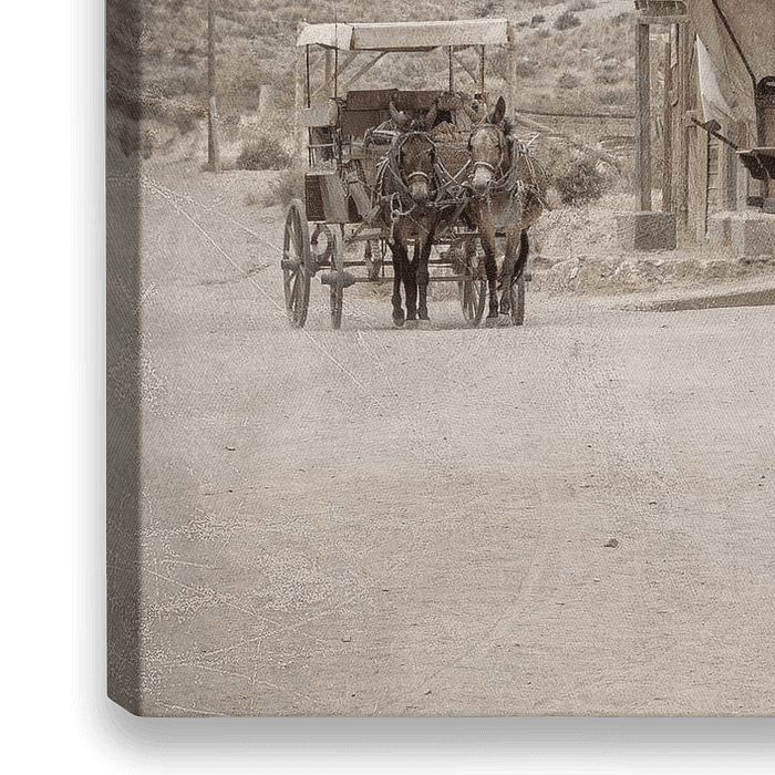 In een stoffig Wild West stadje staat een paard geduldig te wachten op zijn baas, die waarschijnlijk nog in de kroeg zit. Op de achtergrond staan twee huifkarren en er nadert een lege koets, wat het tafereel een geheimzinnige sfeer geeft...Waar is de bestuurder?