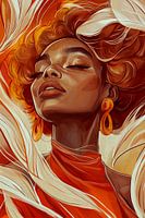 Een expressief en sensueel portret van een vrouw die volledig in haar kracht staat. De oranje en roodtinten dansen om haar heen als vurige linten, terwijl haar gesloten ogen en subtiele glimlach innerlijke rust en zelfvertrouwen uitstralen.