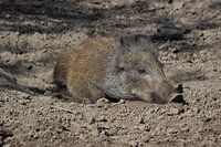 Portret van een wild zwijntje,lekker lui liggend in de modder aan het genieten van de zon. Het wild zwijn, everzwijn of kortweg ever genoemd, is een zoogdier uit de familie van de varkens.