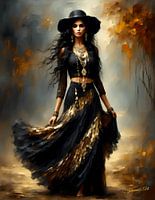 Een vrouw met lang donker haar draagt een breedgerande hoed en een uitgebreide zwart-gouden outfit met een vloeiende rok en een kortgeknipt topje. Ze is versierd met zware gouden sieraden en de achtergrond suggereert een mix van herfstkleuren met abstracte hints.