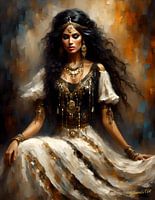 Een vrouw met lang, donker haar is getooid met luxe gouden sieraden en een weelderige witte en gouden jurk, zittend tegen een gevlekte bruine en blauwe achtergrond. Ze draagt dramatische make-up en een serieuze uitdrukking, wat bijdraagt aan het koninklijke en mysterieuze aura dat haar omringt.