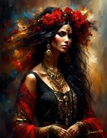 Een vrouw met opvallend donker haar versierd met rode bloemen staart mysterieus opzij. Ze draagt luxe gouden sieraden, waaronder oorbellen, kettingen en armbanden, die een aanvulling vormen op haar zwarte en rode kleding.
