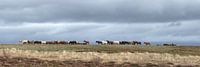 Bij Husavik in het Noorden van IJsland lopen wilde paarden aan de horizon.