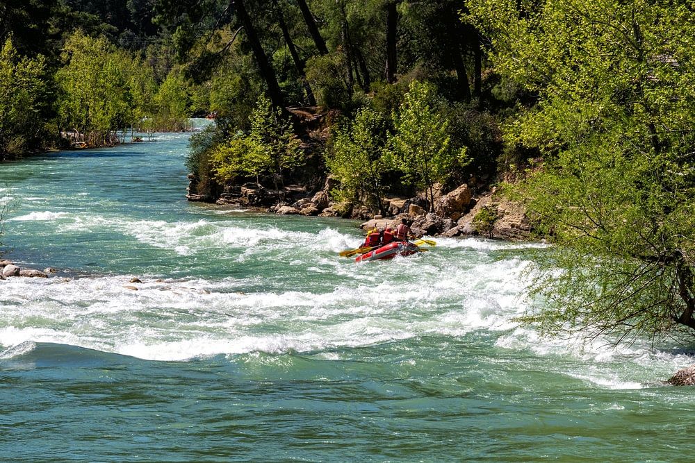 Raften, opblaasboot, canyon, Antalya, wildwater, Turkije, avontuur, rivier, watersport, stroomversnelling, peddelen, outdoor, boottocht, vakantie, activiteit, sensatie, natuur, toerisme, actie, groep, team, ervaring, excursie, sport, water, plezier, familie, bergwater, vegetatie, rotswand