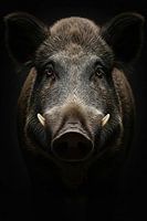 Close-up portret van een wild zwijn's gezicht tegen een donkere achtergrond. De details van de vacht en de slagtanden zijn duidelijk zichtbaar.