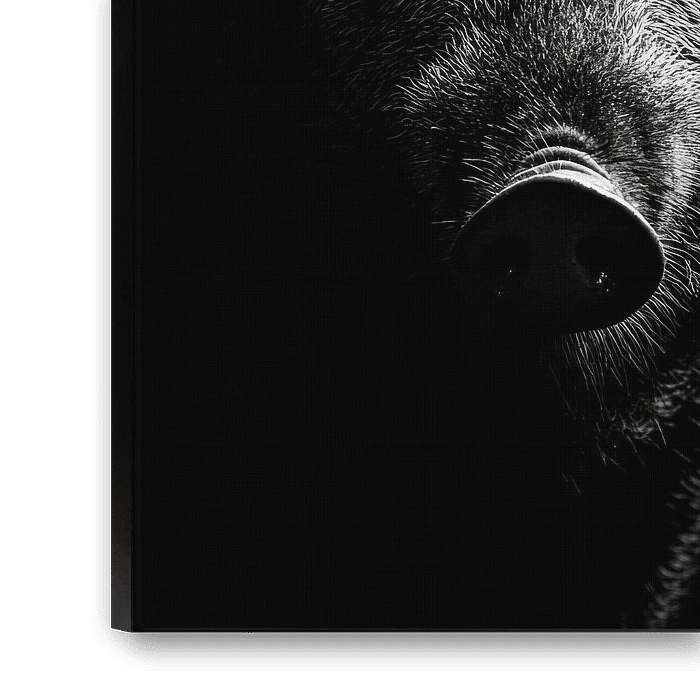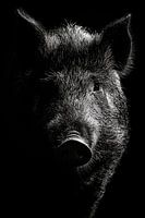 Een betoverend portret dat de krachtige aanwezigheid van een wild zwijn vastlegt in een dramatische belichting. De contrasterende schaduwen benadrukken de majestueuze gelaatstrekken, terwijl de diepzwarte achtergrond voor nog meer drama zorgt. Perfect voor in de woonkamer, het voegt een gedurfde, natuurlijke touch toe aan elke kamer en moedigt conversatie aan.
