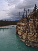 Landschapsopname van kleurrijke rotsen met zichtbare gesteentelagen aan de oever van de wilde Athabasca-rivier in Jasper National Park, Alberta, Canada in de Rocky Mountains op een bewolkte dag in de herfst met naaldbomen.