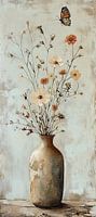 Wilde Bloemen | Serene Harmony of Nature - Dit bloemen schilderij toont een reeks delicate, willekeurig geplaatste wilde bloemen in subtiele tinten, variërend van wit tot oranje, harmonieus gerangschikt in een verweerde, metalen vaas, met een elegant poserende vlinder prominent aanwezig, wat een vleugje levendigheid toevoegt aan het rustige tafereel.