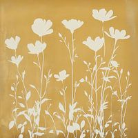 Een strak en sfeervol kunstwerk waarin witte silhouetten van wilde bloemen zich zachtjes aftekenen tegen een warme gouden achtergrond. Dit ontwerp, geïnspireerd door houtdrukken, gebruikt een eenvoudige zeefdruktechniek met platte, zachte beige en witte tinten. De combinatie van grafische lijnen en subtiele texturen geeft het werk een…